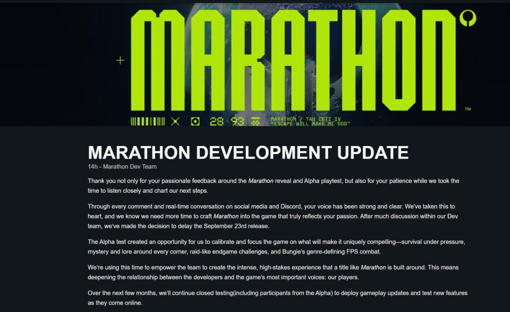 أعلنت شركة Bungie عن تأجيل إصدار لعبتها القادمة Marathon والتي كانت مقررة سابقًا للإطلاق في 23 سبتمبر 2025 دون تحديد موعد جديد.