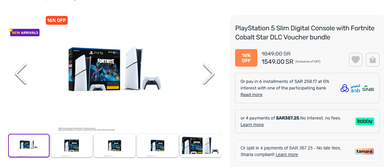 – توفر حزمة جهاز PlayStation 5 Slim Digital مع قسيمة محتوى إضافي للعبة Fortnite: Cobalt Star DLC بسعر 1549.00 ريال سعودي.