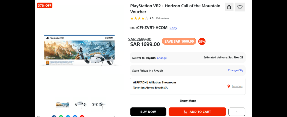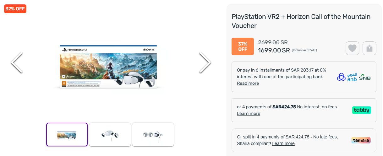 – تخفيض 37% لجهاز PlayStation VR2 مع قسيمة لعبة Horizon Call of the Mountain حيث سعره 1699.00 ريال سعودي.