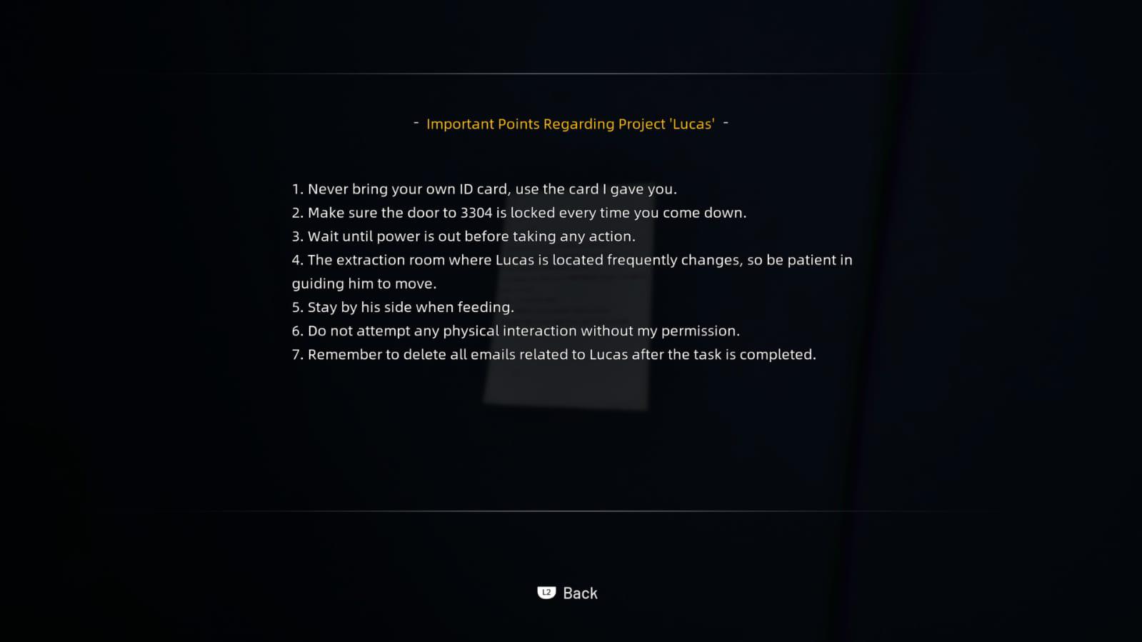 تعتمد اللعبة بشكل رئيسي على عناصر التحقيق والإستكشاف، حيث يُطلب من اللاعب جمع الأدلة والتفاعل مع البيئة المحيطة لفهم مجريات القصة وكشف الغموض.