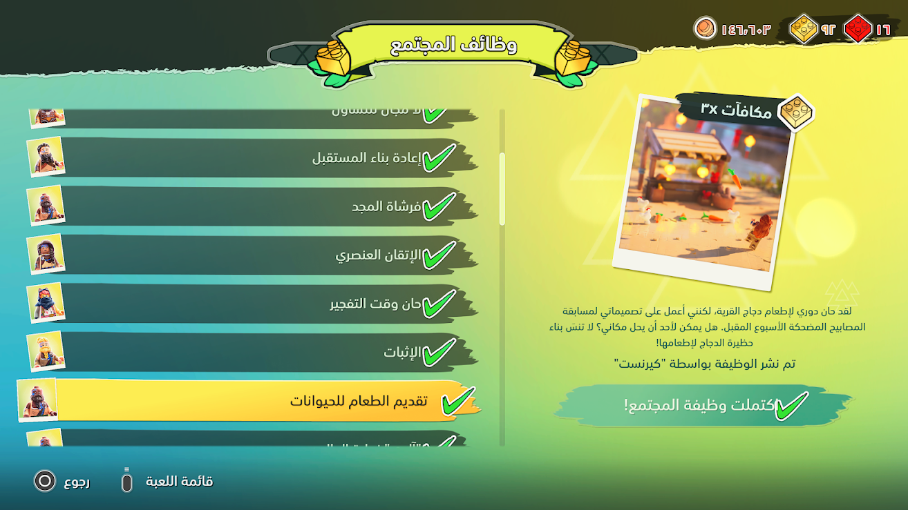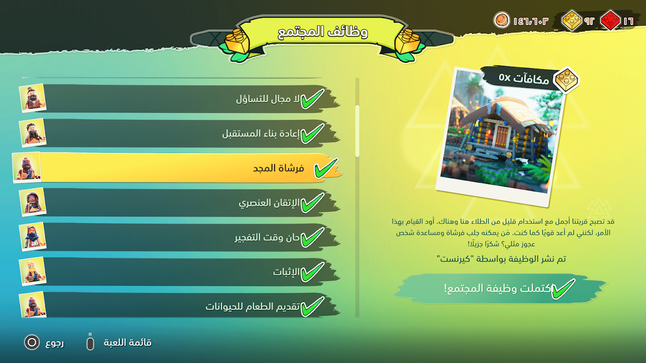 - في منطقة قلب الأم يمكن العثور على لائحة وظائف المجتمع وهي عبارة عن مهام جانبية يقدمها القرويون من شخصيات الليغو NPC.